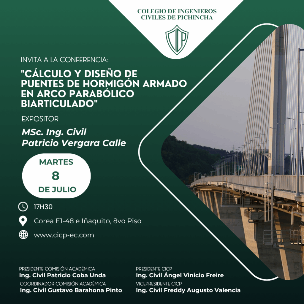 La Comisión Académica del Colegio de Ingenieros Civiles de Pichincha invita a este evento para profundizar y actualizar los conocimientos sobre «Cálculo y diseño de puentes de hormigón armado en arco parabólico biarticulado».