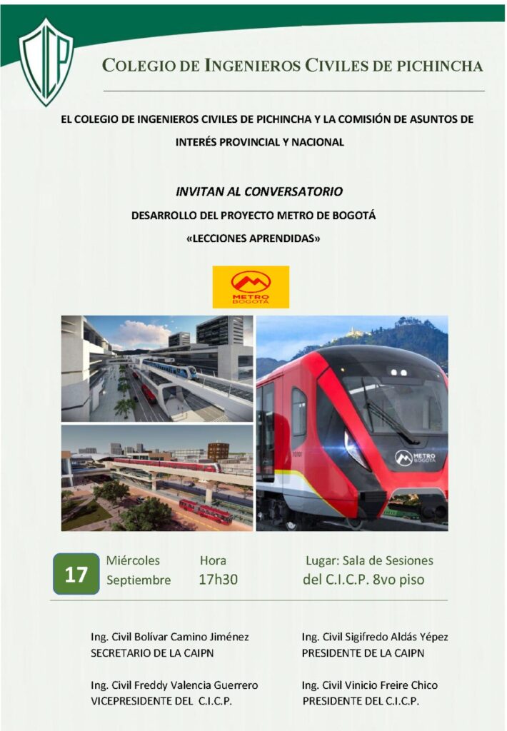 Este miércoles 17 de septiembre, les invitamos al conversatorio, sobre experiencias de la visita técnica realizada por un grupo de miembros del Colegio de Ingenieros Civiles de Pichincha al Metro de Bogotá.